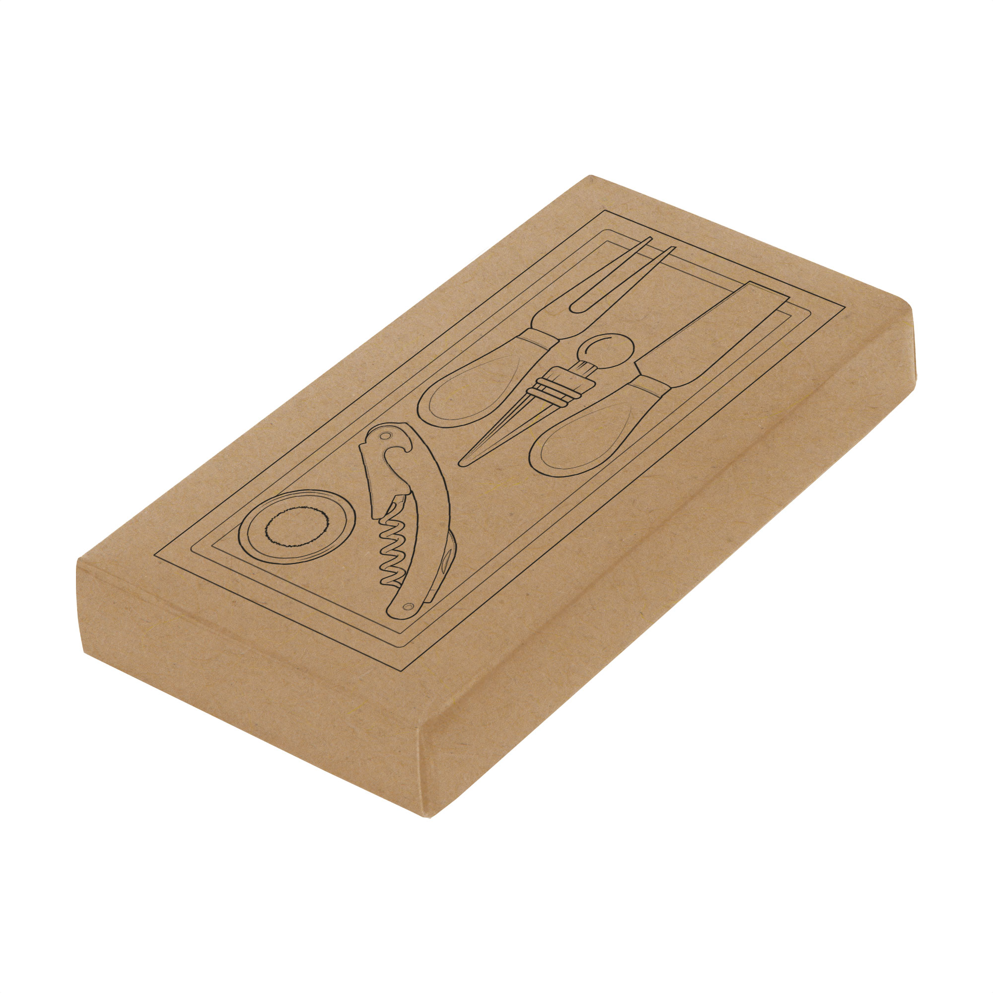 Set de accesorios para vino y corte de quesos. Caja con tapa deslizable de bambú. Tapa / tabla de corte de 24 x 12 x 0,8 cm. Contiene 5 piezas: Destapador sacacorchos (acero inoxidable 420, 11 cm. y 50 g.); Cuchillo y tenedor de queso (acero inoxidable 420 con mango de madera de caucho, 12,8 cm. y 25 g. c/u) Anillo de vino (acero inoxidable 420 y non woven, Ø 3,9 cm.) ; y Tapón de vino (aleación de zinc, 56 g.).